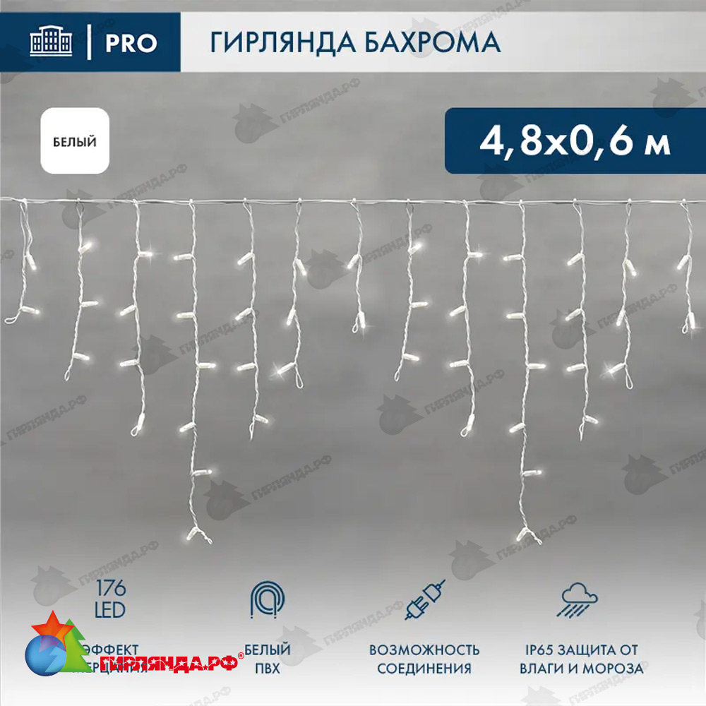 - ✅ Гирлянда светодиодная Бахрома (Айсикл) 4,8х0,6м 176 Led Холодный Белый пвх IP65 эффект мерцания 230В 14-2119 купить в Москве