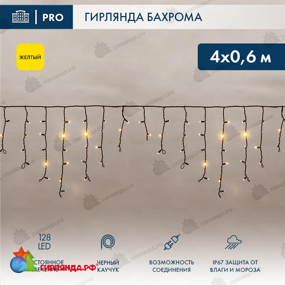 - ✅ Гирлянда светодиодная Бахрома (Айсикл) 4х0,6м 128 Led Желтый черный каучук 2,3мм IP67 постоянное свечение 230В 14-2151 – цена 4529.1 руб.